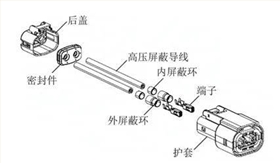 高壓連接器主要用來連接導線和高壓設備,經過高壓導線及高壓設備的電流高達幾百安,其產生的電磁干擾不容忽視,必須考慮360°的屏蔽方式。目前,高壓導線一般有一層屏蔽層,該屏蔽層通常由編織線和鋁箔共同構成。相應的,高壓連接器在設計時也集成有屏蔽層,如下圖所示。連接器的屏蔽層通過屏蔽環和導線的屏蔽層連通,實現360°屏蔽。