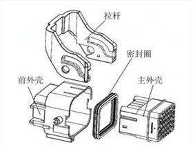 高壓連接器結構更加精密復雜,與低壓連接器相比,主要增加了內外屏蔽環及高壓互鎖。低壓連接器結構組成如下圖所示,一般由拉桿、密封圈、殼體、TPA等結構組成。